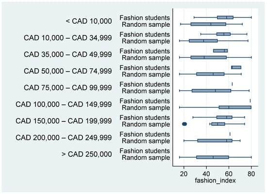 Figure 9 presents the box plot divided by sample and income. It suggests that the students have a higher fashion index than the random Ontario sample in each income group. This result also explains that the fashion index does not increase with income. Usually, students do not have a high income, but they have higher values on the fashion index.