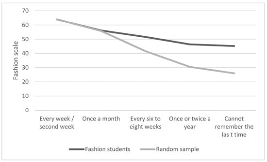 We also tested differences in the fashion scale for high-frequency and low-frequency textile shoppers using an ANOVA, and when controlled for the sample group. The ANOVA is significant (p < 0.0001, adjusted r2 = 0.58), and both the sample group and shopping frequency are significant (p < 0.00001 for both). The interaction between the two independent variables is also significant (p < 0.00001). The result is presented in Figure 10. It suggests that fashion students have higher values, but the shopping frequency and being a fashion student interact. While both groups are very similar in the fashion scale if they are high-frequency shoppers, they differ for low-frequency shoppers. Even if fashion students do not shop that often, they have higher fashion scale values than participants from the random sample.