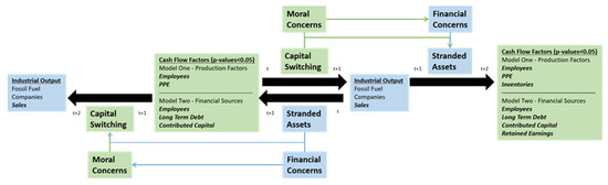 Furthermore, the Granger causality tests suggest a bi-directional causality between financial factors and sales. A change in financial inputs changes sales and vice versa. The bi-directional causality between the cash flow factors and the industrial output that has already been identified by Waddock and Graves [11] for CSR is presented in Figure 2. Capital switching precedes the stranded assets. Ethically motivated divestment might lead to withdrawals of financial capital from the fossil fuel industry, leading to a decrease in financial capital needed to maintain sales and industrial output, including the exploitation of fossil fuel resources [40].