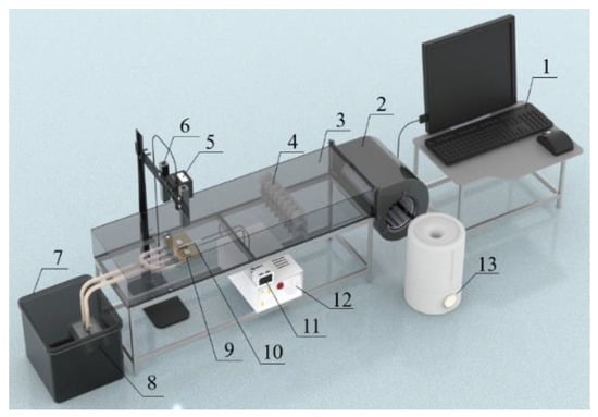 Schematic diagram of the experimental apparatus used in this work. 1. PC. 2. Centrifugal fan. 3. Transparent acrylic air duct. 4. Airflow straightener. 5. Camera. 6. Cold light source. 7. Water tank. 8. Circulating water pump. 9. Semiconductor refrigeration table. 10. Thin-film temperature transducer. 11. Temperature and humidity data logger. 12. Power supply. 13. Humidifier.
