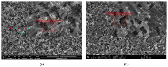 In order to elucidate the reason for why the surface after etching was superhydrophilic, while etching and modification caused the superhydrophobic properties, specimens 4 and 6 were scanned with an electron microscope to observe any changes in their surface microstructure. Figure 2 shows the surface scanning electron microscope (SEM) images of these two specimens. From Figure 2a, a regular stepped structure with a micro–nano size was highlighted on the surface after etching. This stepped structure formed numerous interlaced micro-nano pores. As a result, the droplets in contact with the etched surface penetrated into the pores and spread over the surface of the specimen. This explained why the surface was superhydrophilic after etching. It is also evident from Figure 2b that a layer of a cotton-flocculent low-chemical energy substance uniformly adhered to the step structure of the modified specimen surface. That is because the superhydrophilicity of the specimen surface made the modified solution enter the micro–nano pores of the specimen surface after etching. After thermal curing, fluorosilane was retained by the pores, leading to the superhydrophobic property of the surface.
