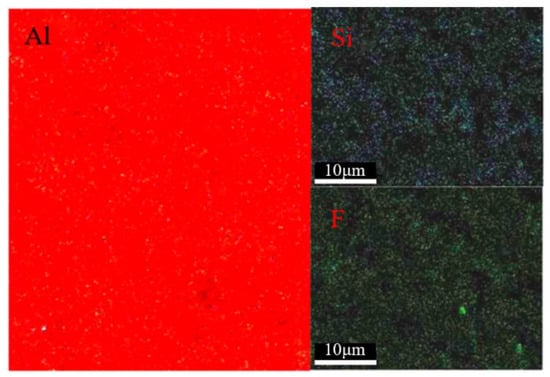 Based on Table 3, the prepared superhydrophobic specimen contained only five elements: C, O, F, Al, and Si. Their atomic concentrations changed in descending order as follows: Al > C > O > F > Si, where C, O, F, and Si elements were obtained in the modification solution. According to Figure 3, the homogeneous distribution of F and Si on the surface of the specimen indicated that the low-chemical-energy substances were uniformly attached to the surface of the specimen, endowing the Al surface after chemical etching with the superhydrophobic property.