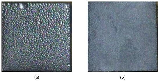 The condensation process of water vapor in moist air on the cold surface is the basic stage of condensation and frosting. Thus, exploring the condensation characteristic of a superhydrophobic surface would help us to gain insight into the frost-suppression mechanism of the superhydrophobic surface. The condensation experiments of the bare Al surface and the superhydrophobic Al surface were therefore carried out using the experimental platform mentioned in Section 2.3. The relative humidity of the experimental environment was 70% and the temperature was 11 °C. Figure 4 displays the condensation state of droplets on the two surfaces after 25 min of exposure to the temperature of −1 °C. It could be seen from the figure that the condensed droplets spread on the cold bare Al surface, and the size of a single droplet was large, while the contact area between the droplets on the superhydrophobic Al surface was small and the droplets had a spherical shape.