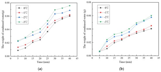 In order to make the cold surface undergo droplet condensation without the condensation of moist air, the temperature of the surface should not be too low. In this experiment, the cold surface temperature was adjusted to 0 °C, −1 °C, −2 °C and −3 °C, to investigate the condensation characteristic of the superhydrophobic surface. The amount of condensed water on the two surfaces was measured every 5 min to obtain the relationship between the amount of condensed water and time at different cold surface temperatures and the result are plotted in Figure 5.