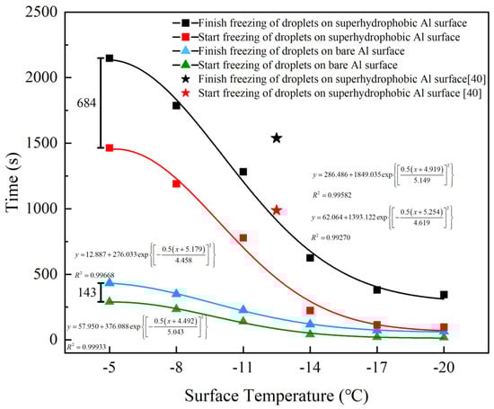 Frost crystals are always formed first on a frozen droplet, so the moment that the droplet freezes matches the onset of the growth of the frost layer. If the freezing of the droplets is delayed, the start of frost will also be retarded. Therefore, delaying the freezing of the droplets is important for frost suppression. In this work, an experimental study of the freezing process of droplets was performed on the bare and superhydrophobic Al surface. The relative humidity of the experimental environment was 81% and the temperature was 22 °C. The cold surface temperature was adjusted to −5, −8, −11, −14, −17, and −20 °C in turn. In order to make the cold surface undergo droplet condensation without the condensation of moist air, the temperature of the surface should not be too low. In this experiment, the cold surface temperature was adjusted to 0 °C, −1 °C, −2 °C and −3 °C, to investigate the condensation characteristic of the superhydrophobic surface. In particular, the freezing time of the first droplet on the cold surface was taken as the start freezing time and the freezing time of all droplets on the surface was considered the complete freezing time. Figure 7 depicts the times measured for the two surfaces at different temperatures, enabling one to establish the moments at which droplets started and finished freezing.
