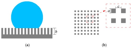 The reason for why the superhydrophobic surface exhibits this antifreezing characteristic is that the thermal resistance of droplets on this kind of surfaces is high. Therefore, the next step was to analyze the thermal conductivity during freezing of droplets on the superhydrophobic surface. It is known that the contact surface between the droplet and the superhydrophobic surface is a composite solid-liquid-gas interface and the droplet on the superhydrophobic surface is in Cassie-Baxter state [35]. Figure 8 illustrates the Cassie-Baxter model of a condensed droplet and the schematic diagram of the micro-nano structure of the superhydrophobic surface. The length, width and height of individual papillae of the micro-nano structure are assumed to be a, a and b, respectively, and the spacing between adjacent papillae is c. The thermal conductivity of air is 0.023 W/(m·K); the thermal conductivity of Al is 273 W/(m·K).