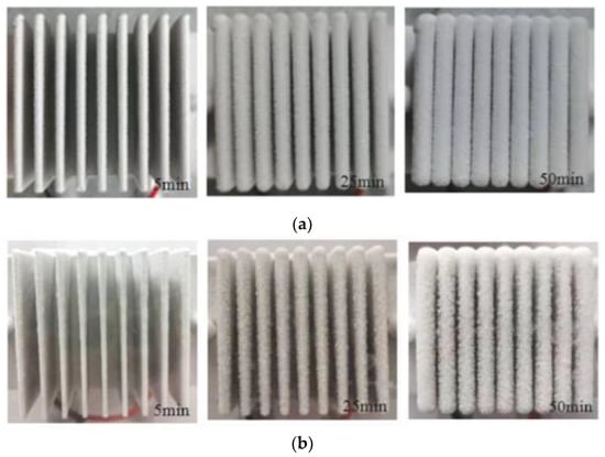 To advance the application of superhydrophobic surfaces at the heat exchanger scale, vertical fin bare and superhydrophobic Al bases (hereafter referred to as the bare Al base and the superhydrophobic Al base), both simulating the distribution of actual heat exchanger fins, were afterwards prepared in this work. The shapes of the Al bases are shown in Figure 10. Experimental studies were carried out to elucidate the frost-suppression and melting effects for these bases. During experiments, the ambient temperature was 7 °C and the relative humidity was 37%. The temperature of the cold surface was adjusted to −18 °C in order to create a uniform needlelike layer of frost on each fin, considering that the refrigeration table provided cooling to several fins. The frosting on both surfaces is illustrated in Figure 10, and the change in the weight of the frost layers within 60 min of frosting is shown in Figure 11.