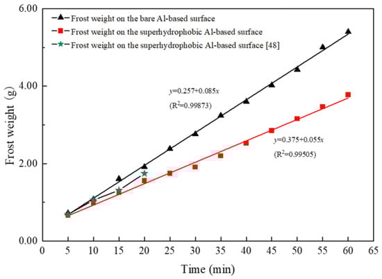As can be seen from Figure 11, frost crystals have been formed on both Al-based surfaces by 5 min after the start of frosting. The amounts of frosting on the superhydrophobic and bare Al-based surfaces were 0.6588 g and 0.7218 g, respectively. After 25 min of frosting, the frost layers entered the full development period and widely appeared on both surfaces. Thus, the weights of frost on the superhydrophobic and bare Al-based surfaces were 1.746 g and 2.3824 g, respectively. The quantity of frost on the superhydrophobic Al-based surface was only 73.29% of that on the bare Al-based surface, which indicated that the superhydrophobic surface had an excellent frost-suppression property in the early stage of frosting. By 50 min of the frosting process, the frost weight on the superhydrophobic Al-based surface was still 71.36% of that of the bare Al-based surface. According to linear fitting, the average growth rate of frost weight was 0.08481 g/min for the bare Al-based surface and 0.05529 g/min for the superhydrophobic Al-based surface. And the experimental data in this paper are roughly consistent with the experimental data of Jing [48]. One could thereby conclude that the superhydrophobic Al-based surface was endowed with a good frost-suppression effect during the whole frosting process.