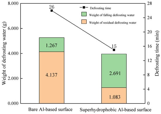 Moreover, liquid films with thicknesses of 1.5 to 4.2 mm were collected on the bottom of the bare Al-based surface and abundant droplets adhered to the vertical fins after defrosting. However, the superhydrophobic Al-based surface had the little droplet retention. As could be seen from Figure 12, 1.267 g of defrosted water was dropped from the bare Al-based surface and 4.137 g of water remained on the surface. In turn, the superhydrophobic Al-based surface lost 2.691 g of defrost water and retained 1.083 g of water. In other words, 76.56% of water remained on the bare Al-based surface after defrosting against 28.70% on the superhydrophobic Al-based surface. In addition, it took 25 min for the frost layer to melt completely on the Al-based surface, while the superhydrophobic Al-based surface took 16 min, which was only 64% of the bare Al-based surface. According to the experimental results, it could be inferred that the application of superhydrophobic technology is promising for reducing the frost melting time and inhibiting secondary frost formation.