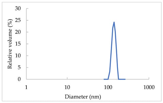 The particle size distribution of NLCs is shown in Figure 1. The mean particle size of NLCs was 140 nm with a zeta potential of −0.52 mV, indicating stable droplets due to the presence of repulsive forces among them [3]. The appearance of only one narrow peak in the particle size distribution diagram indicates the homogeneity of the particle size within the thymol-NLCs. The homogeneity of a system is indicated by the polydispersity index ranging between 0 to 1. The index of zero or close to zero indicates that the system is homogenous [14]. The results from this portion of the study are highly consistent with Karrimi Khorrami et al.’s [13] results on thymol-loaded NLC, Bagheri et al.’s [17] report on thymol-NLC, Almasi et al.’s [11] results on microemulsions containing thyme EO, Akhavan et al.’s [26] report on cinnamaldehyde-loaded NLC, and Sepahvand et al.’s [3] results on thymol-loaded nanoemulsions. Meanwhile, Radi et al. (2021) obtained an average diameter of 94.9 nm for the cinnamaldehyde-loaded NLCs they analyzed [30].