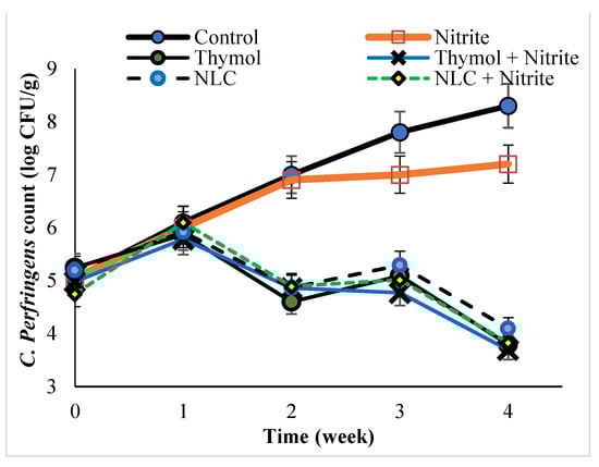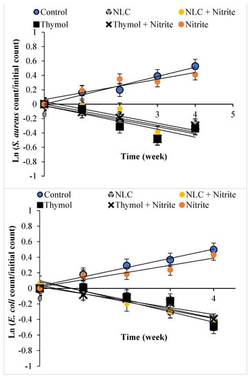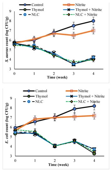 The use of plain thymol, NLC, thymol + nitrite, and NLC + nitrite in the sausage samples resulted in a decreasing trend in the population of all three tested bacteria over 4 weeks of storage (Figure 2), while no significant differences were observed among these samples (p > 0.05). These findings indicate a similar function for the plain thymol, NLC, thymol + nitrite, and NLC + nitrite against each tested bacterium.
