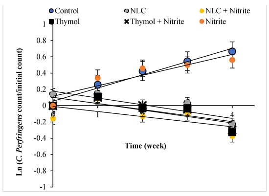 By plotting the logarithm of E. coli, S. aureus, and C. perfringens growth versus time (Figure 3), straight lines were achieved, which were used for the calculation of k values to represent the growth rate of the examined bacteria in the sausage product during 4 weeks of storage. Data are presented in Table 3. High determination coefficients, ranging between 0.82 and 0.99, were obtained for these straight lines (Table 3). According to the results, the growth of the three bacteria obeyed the first-order reaction throughout 4 weeks. The positive k values, obtained for the control and the samples containing 120 mg/kg nitrite, showed an increasing trend in bacterial growth during the 4 weeks. However, the negative k values, obtained for thymol, NLC, thymol + nitrite, and NLC + nitrite, indicated a decreasing trend in bacterial growth within these samples, demonstrating the involvement of a new factor (the antimicrobial agent) on the trend of bacterial growth in the sausage product. The k values of all treated samples showed no significant difference with each other. This shows that the examined bacteria grew according to a similar trend in these samples.