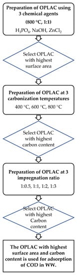 The objective of this study was to prepare an oil palm leaves AC (OPLAC) with a comparatively higher surface area and carbon content, to be used as an adsorbent for organic pollutants forming COD in produced water (PW). The PW is a large effluent, generated as a result of oil extraction, accounting for around three times the amount of extracted oil [34]. Three chemical agents, viz., H3PO4, NaOH and ZnCl2 were used for the activation of OPLs. The OPLACs were prepared initially at 800 °C with a 1:1 impregnation ratio. The OPLAC with the highest surface area was further evaluated for carbon content at three pyrolysis temperatures (400 °C, 600 °C and 800 °C) and chemical agent to material ratios (1:0.5–1:3). The OPLAC with the highest surface area and carbon content was applied for the adsorption of organic pollutants forming COD in PW. The effects of adsorption factors, such as adsorbent dosage, initial pH and contact time on the COD removal percentage were studied. The equilibrium isotherm and kinetic studies were also performed. A comparative analysis with other studies was made to evaluate the performance of the prepared OPLAC. It is the first detailed study reporting the preparation of AC from OPL and applying it for COD removal in PW. The study will help to extend the application of abundantly available OPL waste, to achieve the goals of sustainable development through waste management.