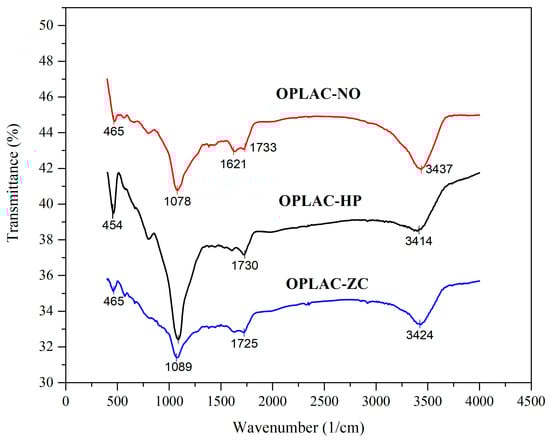 OPLAC-ZC not only had dominant surface properties but also surface functional groups, evident from the FTIR spectra. For the analysis of functional groups present at the surfaces, the three ACs were characterized using FTIR. The results are given in Figure 2. The FTIR spectra of OPLAC-HP, OPLAC-NO and OPLAC-ZC showed broad peaks around 3414, 3437 and 3424 cm−1, respectively, suggesting the presence of a −OH stretching vibration in the hydroxyl groups [49]. The peaks for OPLAC-ZC had the lowest transmittance values, showing the presence of higher hydroxyl groups at the surface, compared to OPLAC-HP and OPLAC-NO. An intense peak of C=O stretching compounds including esters, aliphatic ketones and aldehydes was observed for OPLAC-ZC (1725 cm−1), compared to OPLAC-HP (1730 cm−1) and OPLAC-NO (1733 cm−1) [50]. The other peaks, around 1078, 1089, and below 470 cm−1 wavenumbers suggested the presence of C-O and C=O stretchings and other complex deformations at the surface of the OPLACs [51]. The transmittance values were lower for OPLAC-ZC, indicating the presence of a higher number of functional groups at the surface. It indicated that OPLAC modified by ZnCl2 had superior surface properties for the adsorption of organic pollutants forming COD, compared to the other two OPLACs.