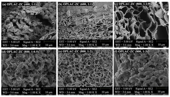 SEM images of OPLAC-ZC at temperatures of (a) 400 °C (1:1); (b) 600 °C (1:1); (c) 800 °C (1:1); impregnation ratios of (d) 1:0.5 (800 °C); (e) 1:2 (800 °C); (f) 1:3 (800 °C).