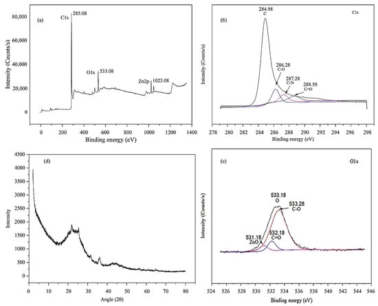 (a) XPS spectra of OPLAC-ZC; (b) C1s XPS spectra of OPLAC-ZC; (c) O1s XPS spectra of OPLAC-ZC and (d) XRD spectra of OPLAC-ZC.