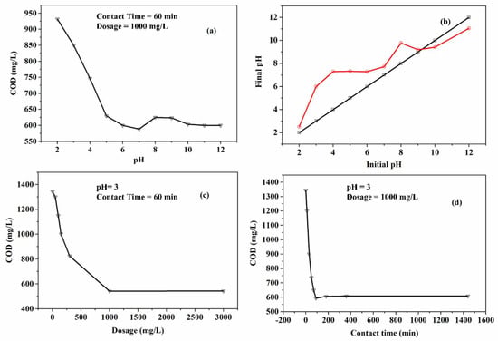 Batch experiments were conducted to study the effect of initial pH levels on adsorptive removal of COD in PW. The initial COD content of PW was 1344 mg/L. It was treated with OPLAC-ZC at various initial pH values, ranging from 2–12, at a dosage of 1000 mg/L and contact time of 60 min at 25 ± 1 °C. The initial pH of PW was adjusted using 0.01 M H2SO4 and NaOH. The final COD was measured after each experiment and the impact of pH on adsorptive removal of COD was studied. Figure 5a shows the results of the final COD in PW, with a change in the initial pH value. The results showed that COD in PW reduced from 1344 mg/L to 588 ± 5 mg/L (56.25 ± 5%), with an increase in pH from 2 to 7. A further increase in pH, from 8 to 12, slightly changed the COD amount. Hence, pH 7 was considered as optimum for the adsorption of COD using OPLAC-ZC. The pH value at which the net charge on the adsorbent’s surface is zero is called the point of zero charge (pHZPC). The surface is positively charged below pHZPC and functional groups are protonated. At a higher pH, the surface gets deprotonated and the negative charge predominates [57]. The pHZPC of OPLAC-ZC was found as a pH of 9 (Figure 5b). Higher COD adsorptive removal was observed at pH < pHZPC, when the surface of OPLAC-ZC was positively charged. It indicated that COD was highly favorable to be removed, due to protonated oxygenated functional groups, involving a π–π interaction between OPLAC-ZC and organic pollutants in PW. Many studies have reported that a pH value of 7–8 is the most suitable value for the removal of COD from wastewater [58].