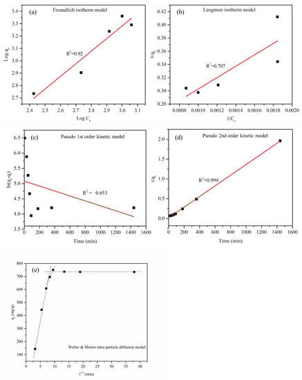 Adsorption isotherm and kinetic models: (a) FIM; (b) LIM; (c) PFO kinetic model; (d) PSO kinetic model; (e) WM intraparticle diffusion model.