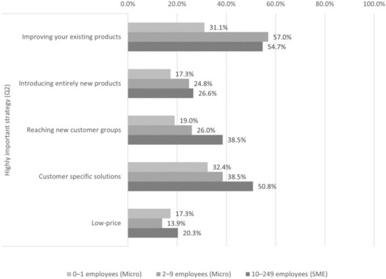 Figure 1, fewer respondents give high importance to the strategy of improving existing products among micro-enterprises with 0–1 employee (31.1%) than both among micro-enterprises with 2–9 employees (57.0%) and SMEs (54.7%; χ