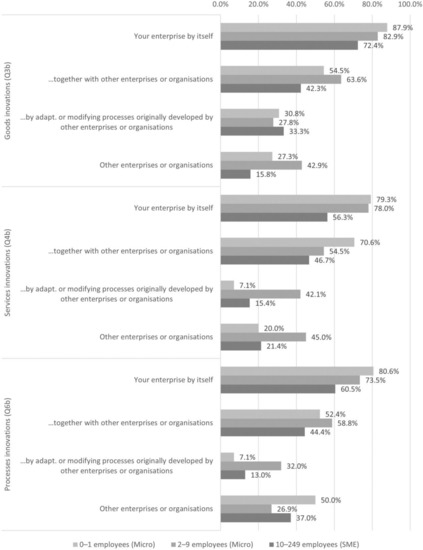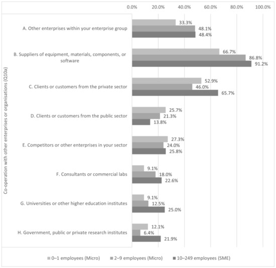 34]. Correspondingly, a Slovenian survey on open innovation found that micro-enterprises collaborate with knowledge institutions (i.e., universities and research institutes) and consultancy companies less often than SMEs, while there are no statistically significant differences in collaboration with customers, suppliers, competitors, and other companies [