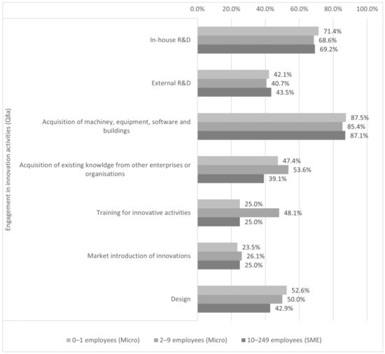 18], H6 is proposed: compared to SMEs, micro-enterprises have fewer in-house research and development innovation activities (H6a), more external research and development (H6b), less acquisition of machinery, equipment, software and buildings (H6c), more acquisition of existing knowledge from other enterprises or organisations (H6d), more training for innovative activities (H6e), less market introduction of innovations (H6f) and fewer innovation activities in design (H6g).
