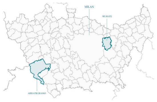 The study area covers the metropolitan area of the city of Milan (Lombardy region), which is located in the north of Italy and specifically covers the municipality of Abbiategrasso and the municipality of Segrate (Figure 2).