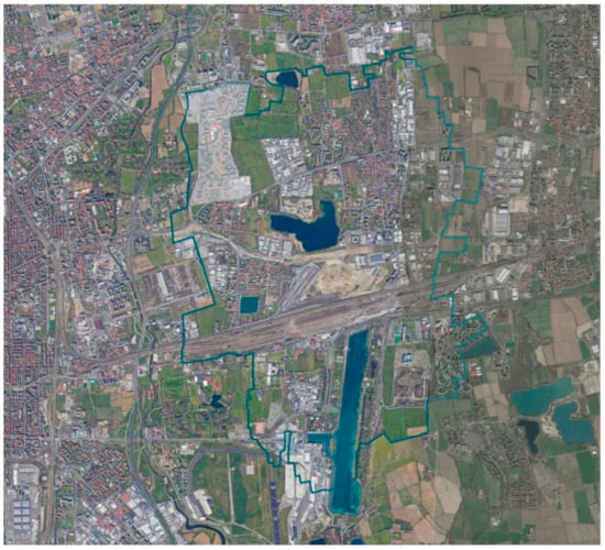 The study area in Abbiategrasso covers part of the consolidated urban fabric of the city center and part of the mixed fabric in the northeast quadrant of the city (Figure 5).