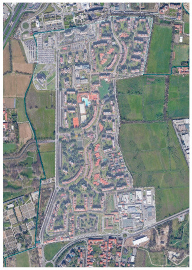 Our study is focused on the district of Milano Due (Figure 4). It is located in the north portion of the municipality and is a residential neighborhood that was built in the 1970s. It is a good example of a modern garden city and has a medium-high density that is characterized by high buildings and wide green open spaces [57].