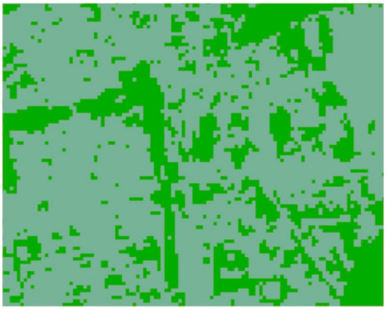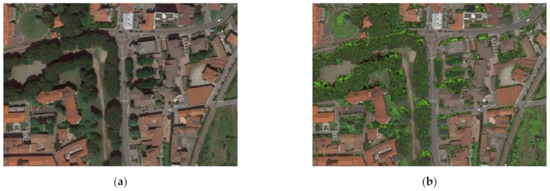 Moreover, one of the advantages of using orthophotos is the possibility of improving the quality of the image by changing the contrast and brightness levels. In our case, the green color has been emphasized, and through visual analysis and pixel selection, we have isolated all the surfaces that are covered by vegetation.