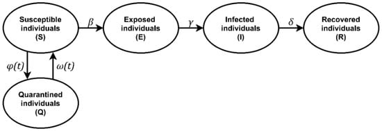 This model assumes a sequential movement between groups from left to right along the route “S–E–I–R” (Figure 1) with the possibility of temporary isolation in quarantine (“Q”). φ(t) and ω(t) in Figure 1 denote scenarios for establishing and removing restrictions, respectively. The speed of individuals’ transitions along the route “S–E–I–R” is determined by the coefficients β, γ, and δ. In this case, β corresponds to the intensity of effective contacts, leading to new cases of morbidity, and γ and δ are quantities inversely proportional to the duration of the incubation period and of the disease, respectively.