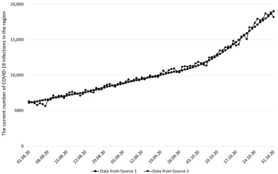 To calibrate the model, historical data on the current number of COVID-19 infections in St. Petersburg, Russian Federation, from 1 August 2020 to 31 October 2020 (three months), were used. This time interval corresponds to complete and consistent datasets from two official sources (to be described further). In addition, for a historical perspective, this period turned out to be the initial stage of a large wave that lasted in St. Petersburg until the beginning of the summer of 2021. In this regard, it is advisable to identify the characteristics of the COVID-19 spread over the wave by calibrating the model on the given dataset.