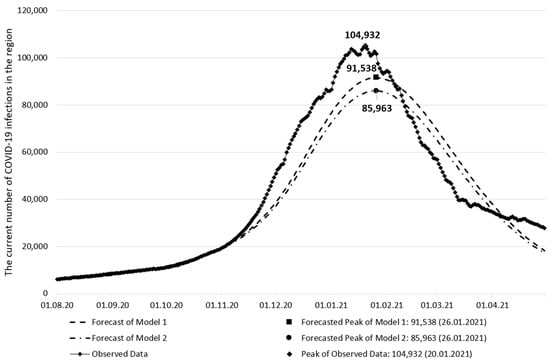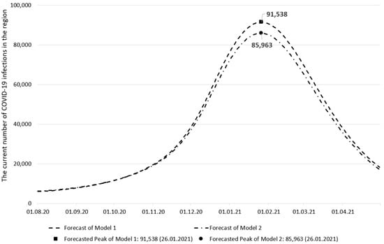 As shown in Figure 3, both models predict the same peak date for the current number of infections (26 January 2021), but the current number of infections on that date differs by 6% (91,538 vs. 85,963). This difference is insignificant, as observed in medium-term forecasts.