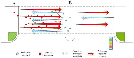 Pedestrian two-stage crossings are generally designed at large and busy signalized intersections with multiple lanes, and allow people to navigate a mid-block crossing in two stages and across each lane of approaching traffic. This design permits the installation of pedestrian traffic signals in a non-aligned pair, that is, one side green and another red. Figure 1 and Figure 2 show examples of pedestrian twice-crossing layout design, and pedestrian signal timings in two directions, respectively. It can be seen that the signal timing in direction B starts first, in one cycle, so pedestrians in direction B perform a partial crossing and then wait in the middle. Then, the first steps are the same for side A navigating the first stage and for side B traversing the second stage. Given the bidirectional interactions with high pedestrian density (appearing in the left part of the crosswalk; see Figure 1), the green timing differences result in crossing behavioral differences between the two sides, such as trajectory, walking speed, grouping, and waiting location. This study concentrates on identifying the behavioral differences between pedestrians on the two sides.