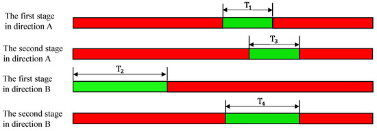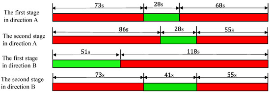 Field data were collected on pedestrian twice-crossing in the east–west direction at the signalized intersection of Nanjing Road and Gong Qingtuan West Road in Zibo City. The overall length of this crossing is 32 m, including two blocks and a refuge island. The layout of the selected pedestrian crossing is shown in Figure 7. Figure 8 illustrates the signal timing and phase sequence for pedestrian twice-crossing at the selected intersection. In this study, the various forces acting upon pedestrians have been examined, focusing on the congested section in block AB.