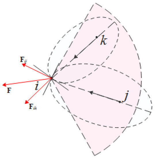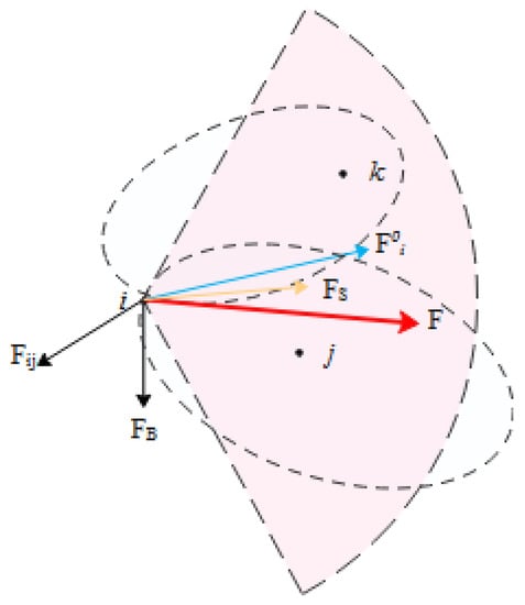 The classical social force model uses forces to describe the specific intrinsic motivation leading to pedestrian’s actions and behavior. Social force consists of three components: the self-driving force of pedestrian α in the ideal state , the interaction between pedestrians, and the resistance produced by obstacle B in pedestrians [23,24]. The model is defined by: