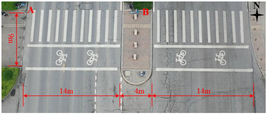An unmanned aircraft was used to collect and record pedestrian data during weekday peak periods, when there was a high volume of pedestrians crossing. Finally, a total of 279 signal cycles was obtained, including 4258 pedestrians on side A and 3561 pedestrians on side B. Pedestrian motion features were measured using kinovea software based on the video files, mainly by extracting pedestrians’ speed and trajectory. The selected signalized intersection is situated close to a gate of the university campus, so pedestrians crossing this intersection were mostly young and middle-aged adults.