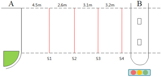 - S4 is located 13.5 m from the stopline in direction A, which is the line at which both sides entirely separate, as shown in Figure 10d. Pedestrians on side A accelerate quickly, without the repulsion generated by others moving in the opposite direction.