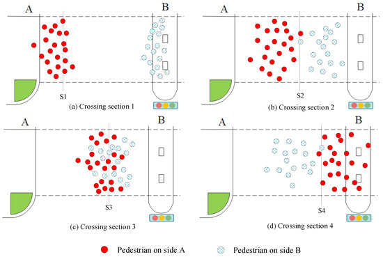 - S1 is located 4.5 m from the stopline in direction A (see in Figure 10a), which is the line at which the pedestrians in the first row of direction A arrive when pedestrians in the first row of direction B have just passed the boundary of the refuge island. At this moment, pedestrian behavior is affected by the self-driving force and the forces generated by other pedestrians moving in the same direction;