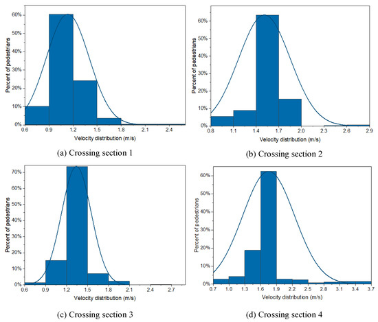 The speed distributions of the four cross-sections are illustrated in Figure 11. It can be observed that the distribution of the cross-sectional speed sharply peaks, and displays thick tails, which indicates that the pedestrian group behaviors are largely consistent in cycles. Therefore, it is reasonable to use the average speed for force measurement.