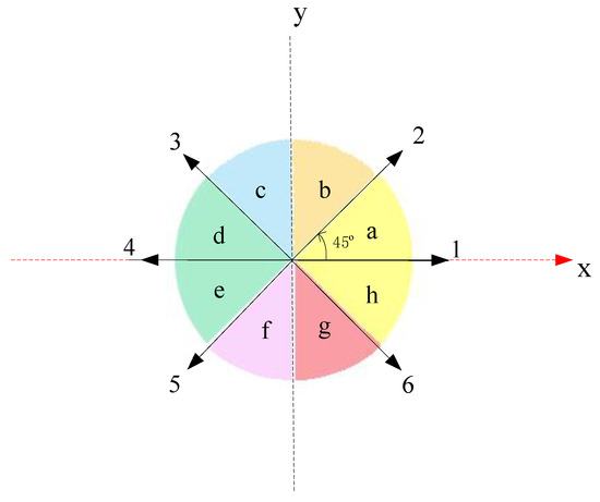 In crowded interactive situations, pedestrians continually change their walking directions. To simplify the analysis and calculation, the walking directions were grouped into six directions, shown in Figure 12. Starting from the horizontal line (x-axis) on the right side, one direction was assigned every 45°, moving in the anticlockwise direction. The directions in the north and south (y-axis) were removed due to their rare appearance. In brief, all the directions were distributed based on the rule of proximity. For example, all the directions in Segment b were allocated to Direction 2. The directions of 21.3° and 29.8° in Section a were assigned to Direction 1 and Direction 2, respectively. Table 4 shows a few examples of sectional velocity data for pedestrians on side A.