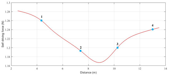 According to the previous studies and our survey, the desired speed for pedestrians on side A was chosen as = 2 m/s. The self-driving force for each section was determined based on the difference between the desired speed and the average actual speed. The trend in self-driving force for pedestrians on side A along the walking direction is shown in Figure 13. The self-driving force is inversely proportional to pedestrians’ actual walking speed, and therefore the faster the actual speed, the smaller the self-driving force. The force acting on the walking direction is taken as positive. The self-driving force ranges from approximately 1.16N to 1.30N, and tends to decrease and then increase in the walking direction. It can be noticed that all the self-driving forces are positive, which means that the actual speeds are always less than the desired speed. Pedestrians are prone to reach their desired speed, but they have little chance to make it. It can also be seen that the minimum force tends to appear at the moment at the beginning of the interaction process between the two sides. This shows that the fastest speed occurs when the interactive activities of the two sides have just begun. Thereafter, the interactive activities begin to reduce the pedestrian walking speeds on side A.