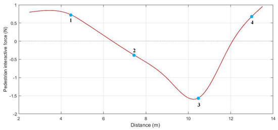 The repulsive effects (negative) are mainly created by pedestrians moving in the opposite direction, and the attractive effects (positive) are mostly created by pedestrians moving in the same direction. Figure 14 shows the trend chart of the resultant forces (combination of repulsion and attraction) generated by the surrounding pedestrians. This force ranges roughly from −1.6 N to 1.0 N, and is inclined to decrease and then increase along the walking direction. It can be observed that the resultant force is negative in the middle section and positive on the two sides. This indicates that during the interactive process, the repulsive forces are typically greater than the attractive forces. Moreover, repulsion begins even though there is still a certain distance between the two sides. The greatest resultant force arises in the most congested interactive condition between the two sides.