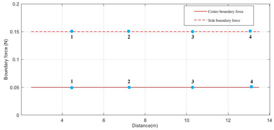 During the crossing, the boundary force is pretty small and fluctuates slightly, so it was regarded as constant for reasons of simplicity. The direction of the boundary force is perpendicular to the longitude boundary of the crosswalk. The boundary force was set as 0.15 N when acting on pedestrians close to the boundary lines, and as 0.05 N when acting on others. Figure 15 shows the trend chart of the boundary force on Side A.