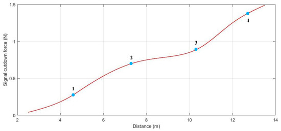 The force generated by the pedestrian green countdown ranges roughly from 0 N to 1.5 N, and increases along the walking direction (shown in Figure 16). It can be observed that all the forces are positive. Generally, the force magnitude of the green light countdown is inversely proportional to the remaining time of the green signal countdown. This relationship does not seem to be linear. The growth rate of the force is lower in the segment between cross-sections 2 and 3 than in other segments. This might be due to the fact that pedestrians give more attention to their surroundings to avoid collisions, and pay less attention to the signal countdown in congested interactive conditions.