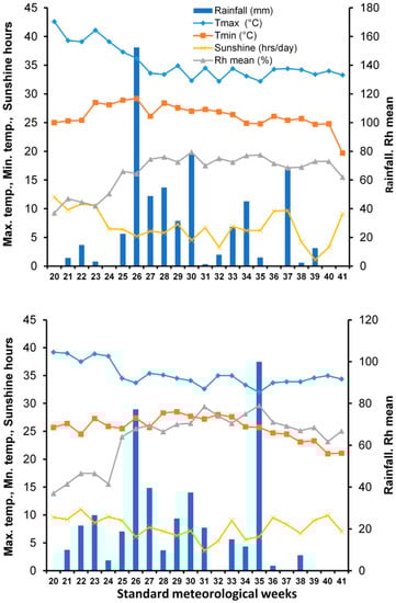 Figure 1 shows the meteorological data recorded at the meteorological observatory of the Punjab Agricultural University in Ludhiana during the crop growing seasons according to conventional meteorological weeks. The mean weekly maximum and minimum temperatures during kharif 2016 ranged from 33.1 to 42.6 °C and 19.7 to 29.2 °C, respectively, whereas in kharif 2017, the corresponding ranges were 32 to 39.2 °C and 21.0 to 28.5 °C, respectively. The maximum weekly rainfall (152.4 mm) was received in the 26th standard meteorological week during kharif 2016 whereas in kharif 2017, it was 100 mm and was received in the 35th standard meteorological week. The mean weekly sunshine hours ranged from 1.1 to 12 and 3.6 to 11 h per day during kharif 2016 and 2017, respectively. During May and October, when the cotton was grown, the average monthly maximum and minimum temperatures varied between 33.4 and 41.0 °C and 17.2 and 26.9 °C, respectively. During the cotton growing season, the average total rainfall was 612 mm.