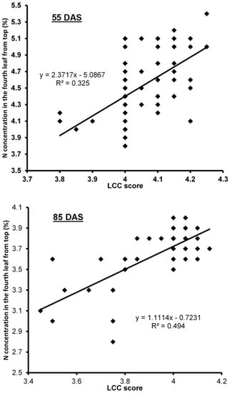 The nitrogen concentration increased with an increasing LCC score as recorded from the fourth leaf from the top at both growth stages (55 and 85 DAS) of Bt cotton (Figure 2). The R2 values of the LCC score and leaf N concentration were greater at 85 DAS than at 55 DAS, indicating that the R2 values of the relationships between the LCC score and leaf N concentration gave a good indication of the leaf N status. At 55 DAS, the leaf N concentration ranged between 3.8 and 5.4%; it was between 2.8 and 4.0% at 85 DAS. Critical LCC scores of 4.1 and 4.0 were established by Arun Shankar et al. [16] to differentiate between the sufficiency and deficiency of N in Bt cotton at 55 and 85 DAS, respectively; the two different growth stages translated into 4.4 and 3.6% N in the leaf, respectively (Figure 2).