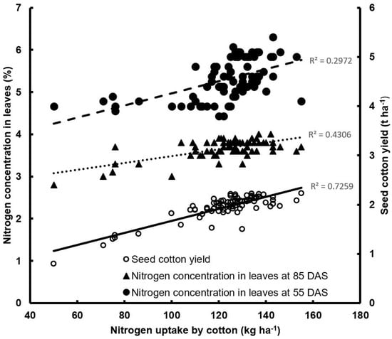 Cotton seed yield (t ha−1) and N concentration (%) in the fourth leaf from the top after 55 and 85 DAS of Bt cotton related to the total N uptake at maturity at Ludhiana, India in 2016 and 2017.