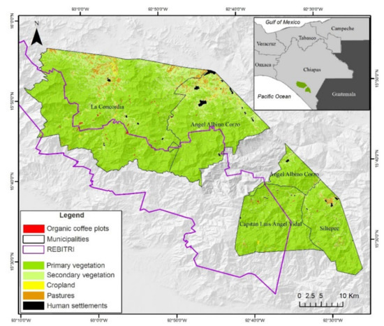 The study area is located in the El Triunfo Biosphere Reserve (REBITRI) and its buffer area, comprising the municipalities of Ángel Albino Corzo, Capitán Luis Ángel Vidal, La Concordia, and Siltepec (Figure 2). Most of the region extends along “The Sierra Madre de Chiapas” (SMC) mountain range, where 85% of the surface corresponds to different types of forests and jungles, both primary and secondary [47], with a high proportion of cloud forests, which stand out as being of high ecosystemic importance [48,49].