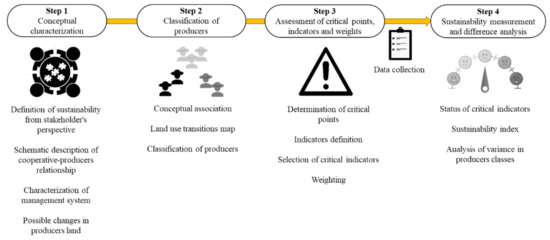 The sustainability of the shade-grown coffee agroecosystem in the REBITRI Biosphere Reserve was assessed using the MESMIS framework. It is focused on integrating both the changes observed in the agroecosystem and the local knowledge. Both quantitative and qualitative methods were used in this assessment for facilitating the measurement and integration of the several perspectives. The methodology was carried out through four steps (Figure 3): (1) conceptual characterization, (2) classification of producers, (3) assessment of critical points, indicators, and weighting, and (4) sustainability measurement and differences analysis. The steps are described below.