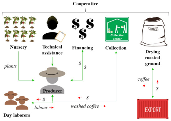 The sustainability of organic coffee production was discussed during workshops attended by coffee producers. They conceptualized sustainability as “everything that allows the activity to be maintained over time”. In order to maintain activity over time, the role of cooperatives is decisive in facilitating production and commercial aspects to producers. Hence, one of the chief results of the workshop was a general scheme of the relationship between cooperatives and producers (Figure 4).